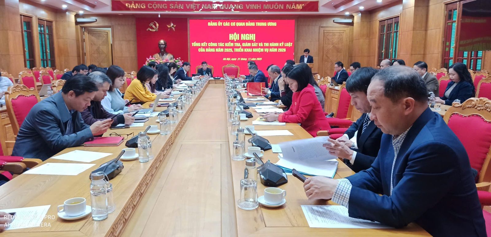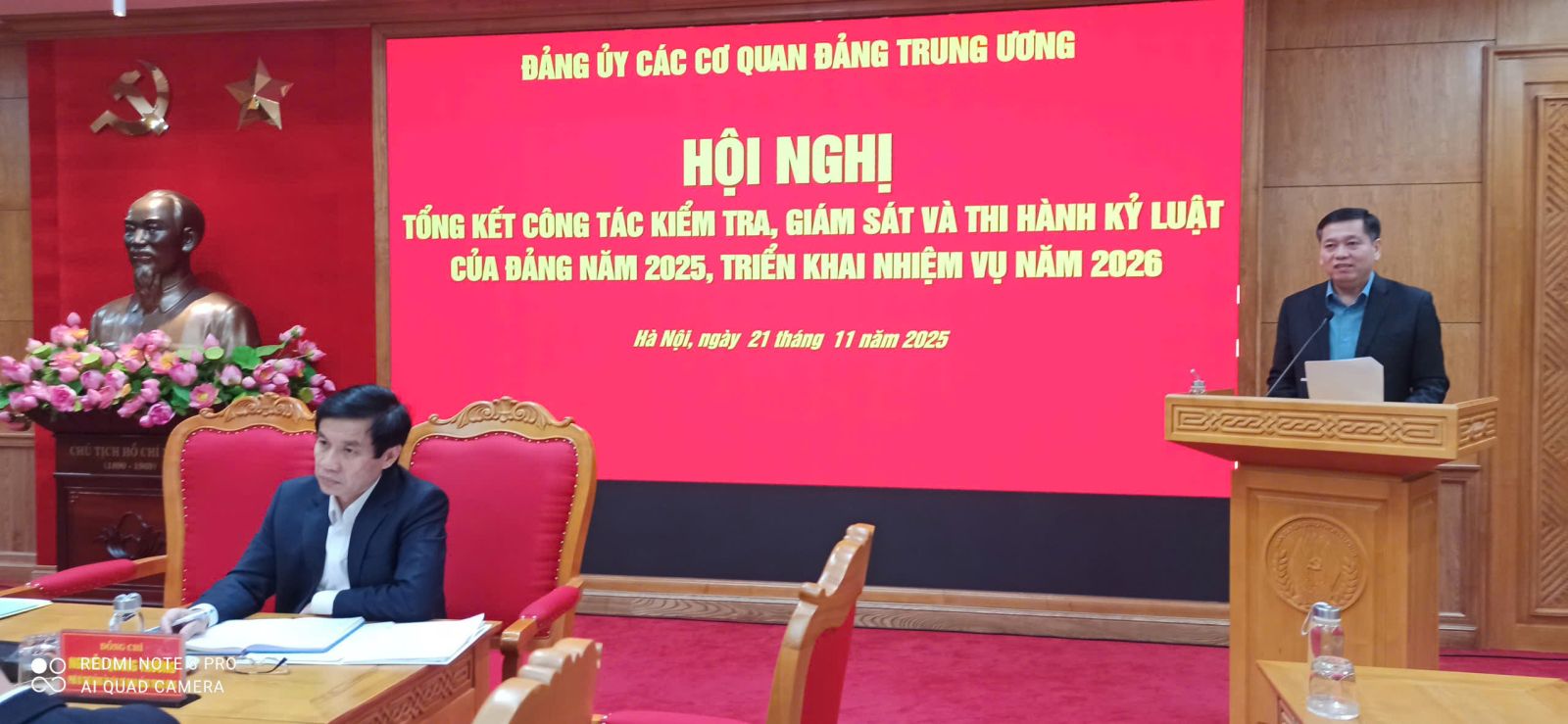 XDĐ - Ngày 21-11-2025, tại Hà Nội, Ban Thường vụ Đảng ủy các cơ quan Đảng Trung ương tổ chức Hội nghị Tổng kết công tác kiểm tra, giám sát và thi hành kỷ luật của Đảng năm 2025, triển khai nhiệm vụ năm 2026.