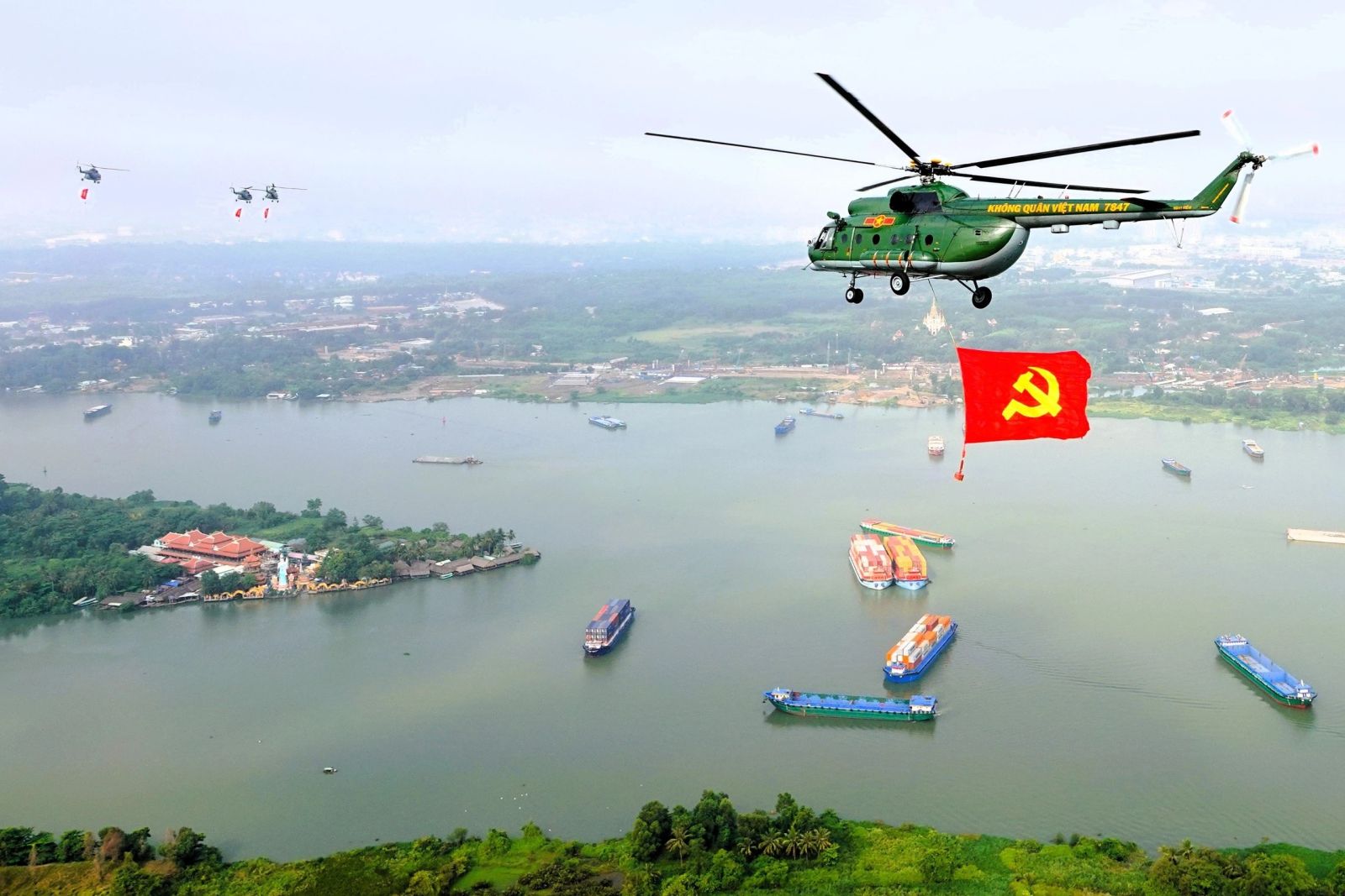 Thành tựu của 40 năm đổi mới về kinh tế, văn hóa, xã hội, quốc phòng, an ninh, quan hệ quốc tế… đem lại lợi ích cho Tổ quốc, nhân dân ta trong những năm qua đã củng cố và nâng cao uy tín của Đảng (Trong ảnh: Máy bay trực thăng quân sự của Quân đội nhân dân Việt Nam bay treo cờ Tổ quốc và cờ Đảng từ sân bay Biên Hòa vào trung tâm Thành phố Hồ Chí Minh trong Lễ kỷ niệm 50 năm Ngày Giải phóng miền Nam, Thống nhất đất nước (30-4-1975 - 30-4-2025)_Ảnh: thanhnien.vn
