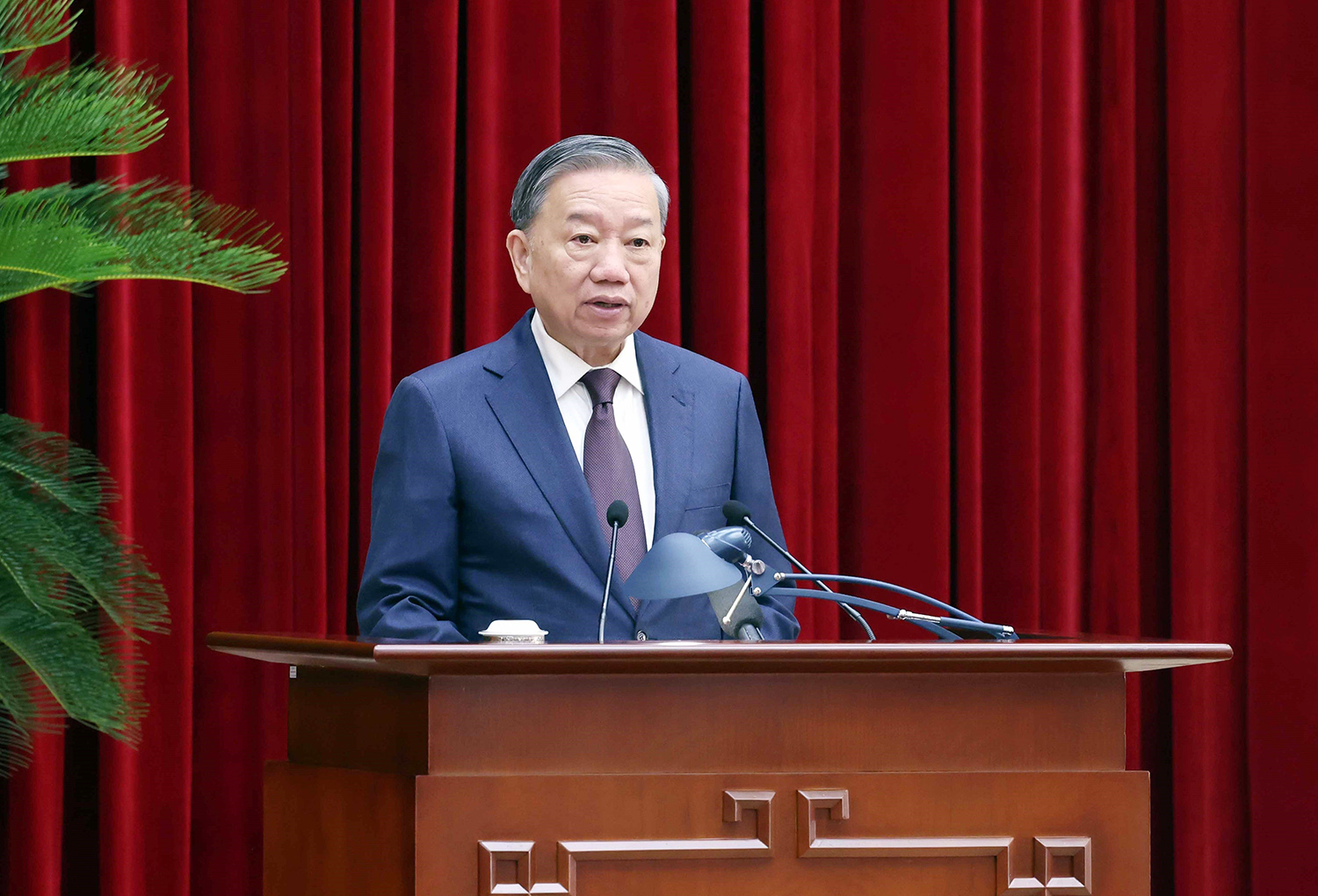 Thay mặt Bộ Chính trị, Ban Bí thư, tôi nhiệt liệt chào mừng các đồng chí đại biểu tham dự hội nghị và gửi lời cảm ơn chân thành tới nỗ lực không mệt mỏi của các đồng chí Ủy viên Ban Chấp hành Trung ương, của toàn thể đảng viên trong thực hiện các nhiệm vụ của Đảng, đặc biệt là những công việc từ sau Hội nghị Trung ương lần thứ mười một đến nay; cảm ơn toàn Đảng đã đoàn kết, đồng lòng cùng nhân dân cả nước hoàn thành xuất sắc nhiệm vụ triển khai mô hình chính quyền địa phương hai cấp vào ngày 1-7-2025 với không gian phát triển mới; đưa dân tộc bước vào một chương mới trong lịch sử hình thành và phát triển của đất nước.